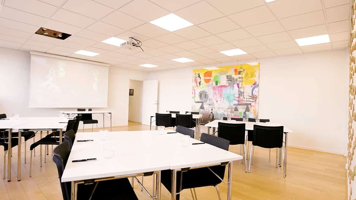 Det er næsten kvadratisk med adgang et lille mødelederrum bagerst i lokalet. Og selvfølgelig med masser af dagslys, som i resten af huset.